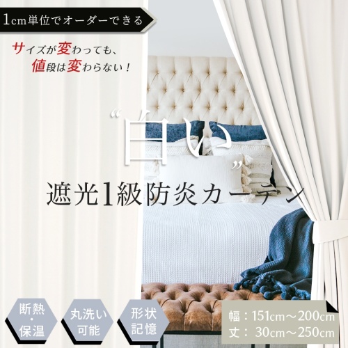| 商品名 | 遮光1級・防炎・断熱 白いオーダードレープカーテン 幅151~200cm×丈30~250cm 1枚 形状記憶加工 |