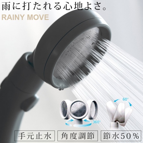 | 商品名 | 節水・角度調節・手元止水機能付きシャワーヘッド「レイニー ムーブ」グレー【日本製】 |
