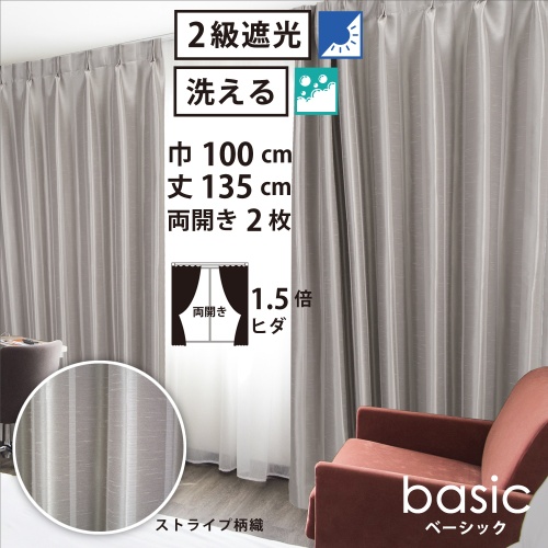 商品名【 遮光 ドレープ カーテン ストライプ柄織 】洗濯OK ベーシック 1.5倍ヒダ (巾100cm 丈135cm) 両開き 2枚