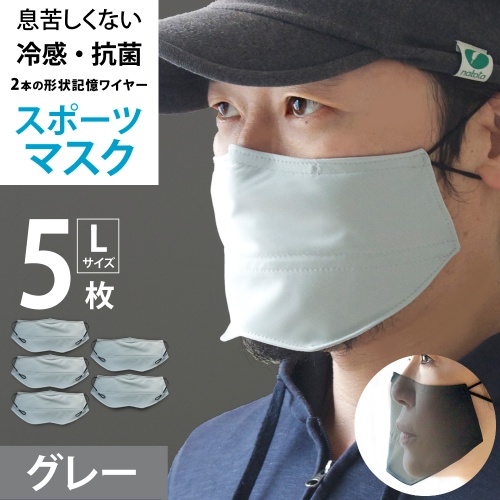 マスク 冷感 UVスポーツマスク抗菌 ( Lサイズ グレー 5枚セット ) 息苦しくない構造を作る2本のワイヤー入り