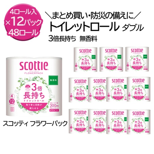 | 商品名 | 3倍長持ちスコッティ フラワーパック トイレットペーパー ダブル 無香料 4ロール×12パック=48ロール 収納 コンパクト |