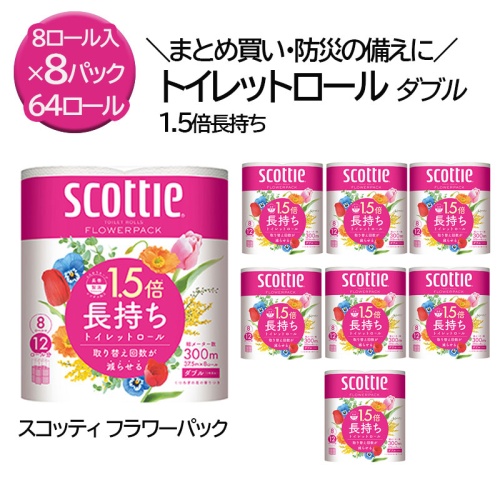 1.5倍長持ちスコッティ フラワーパック トイレットペーパー ダブル 8ロール×8パック=64ロール 収納 コンパクト